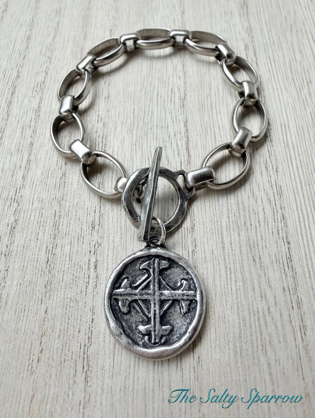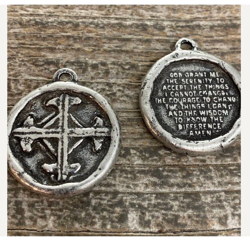 By popular demand, our serenity cross toggle bracelet now in a silver option! Think oxidized diver chain with toggle closure and cross pendant with the serenity prayer inscribed on the back. Our standard size is 7- 7.5” to fit most. Pleases indicate in the notes section when purchasing if you need a different size/length.